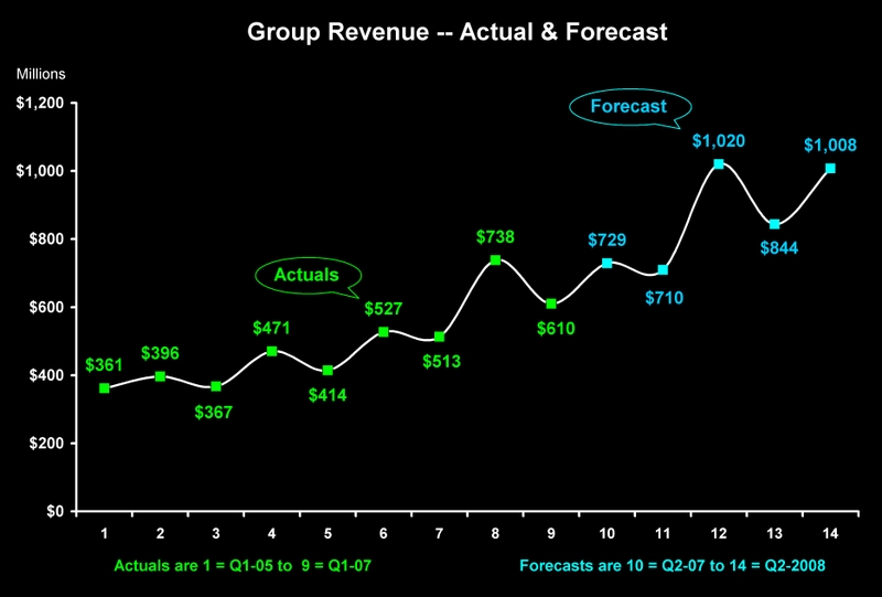 Step 1. Strategic group revenues were $729 million on March 31, 2007. That's the sum of each company's sales in Q1-07. I applied a rolling same-quarter year-on growth rate to forecast group revenues. Using the historical rate of 38%, the result in Q2-08 is $1,008 million in group revenues. Note, in this graphic the historical numbers are green and the forecast numbers are yellow.