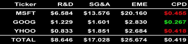 Still there’s a bothersome -12¢ CPD in net Selling & Marketing expenses. Not to mention YHOO’s net CPD disadvantage of -16¢, most of which is also attributable to Selling & Marketing expenses.